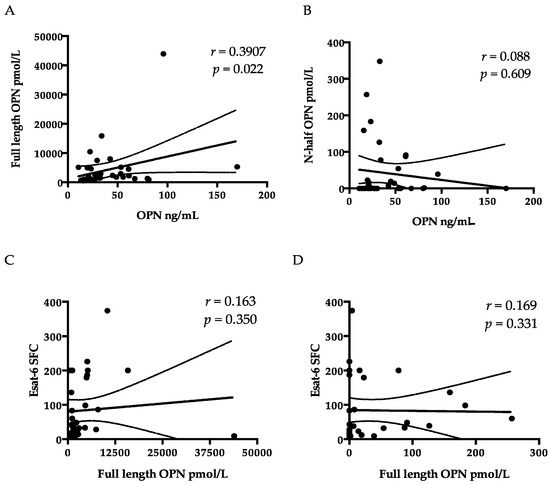 OPN, full-length OPN, n-half OPN, and ESAT-6 SFC count in TB patients. A comparison of plasma levels of OPN with full-length OPN (A) and with n-half OPN (B); and a comparison of ESAT-6 ELISPOT SFC counts with full-length OPN (C) and with n-half OPN (D).