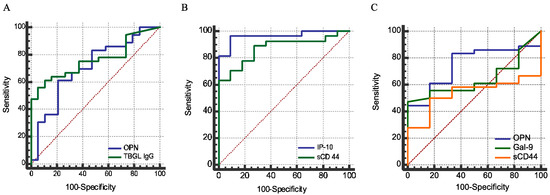 Sensitivity and specificity analysis for OPN, anti-TBGL IgG, IP-10, and sCD44. Comparison between ATB and HCs (A,B), no significant difference between the areas under curve (AUC) of OPN and anti-TBGL IgG, IP-10, or sCD44, p > 0.05. Strong discriminatory power of IP-10 and sCD44; p < 0.0001 for both (A). Comparison between ATB and LTBI, no significant discriminatory power of OPN, Gal-9, and sCD44 in LTBI and ATB (p > 0.05) due to the inadequacy of LTBI subjects (C). No significant difference between the AUC of OPN and Gal-9, between Gal-9 and sCD44, but difference between OPN and sCD44 (p = 0.014) (C).