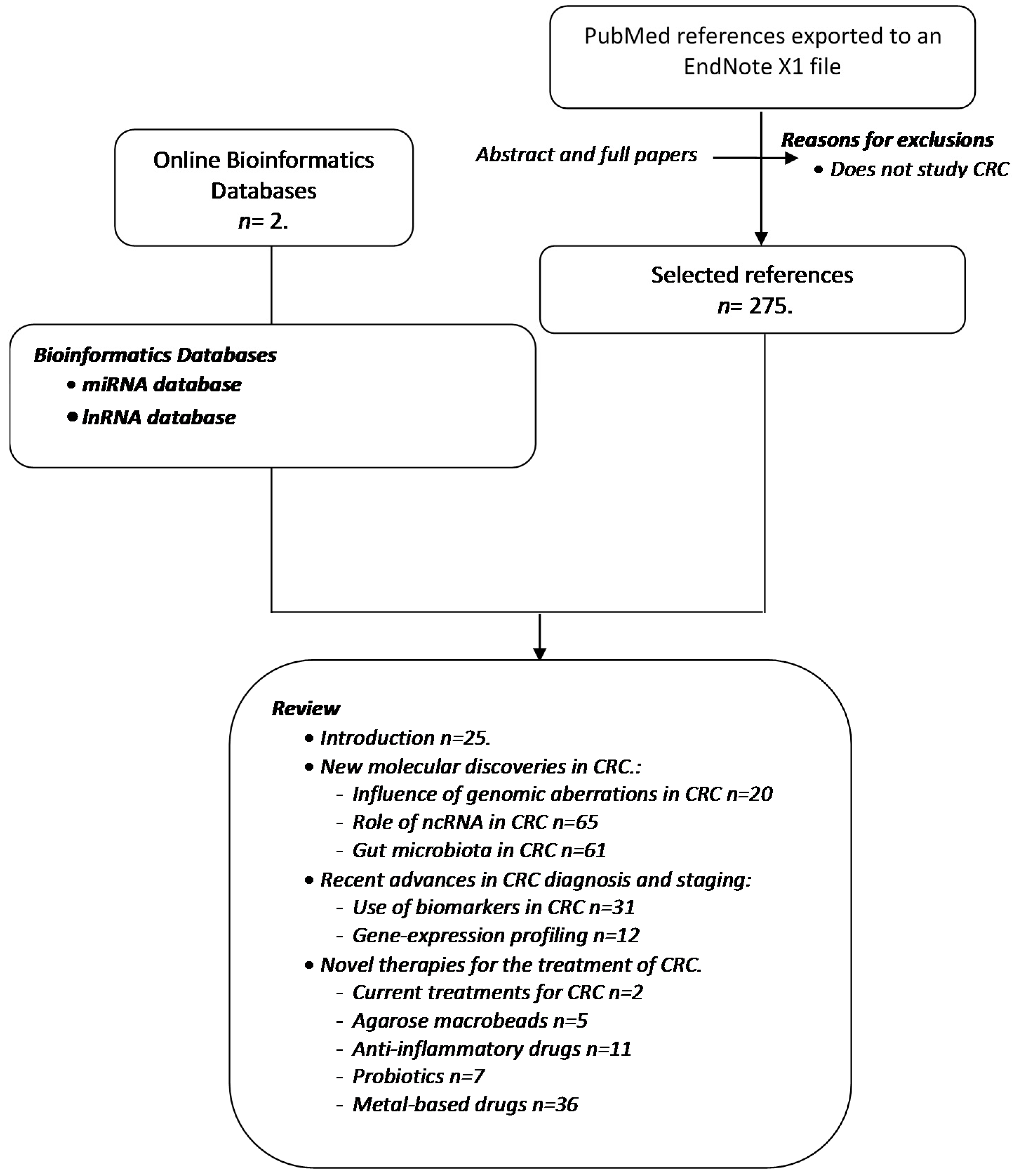 The present report has adhered to systematic review guidelines. All data were collected according to the criteria shown in Figure 1. The search of each of the different parts in PubMed (avaliable on: http://www.ncbi.nlm.nih.gov/pubmed) identified a total of 295 hits from November 1945 to July 2014. In addition, a search was carried out in the databases Long Noncoding RNA Database v2.0 [1,2] and miRCancer: a microRNA-cancer association database [3,4,5] and the results obtained were corroborated by a literature search in PubMed. The combined information from these two sources formed the basis of this review.