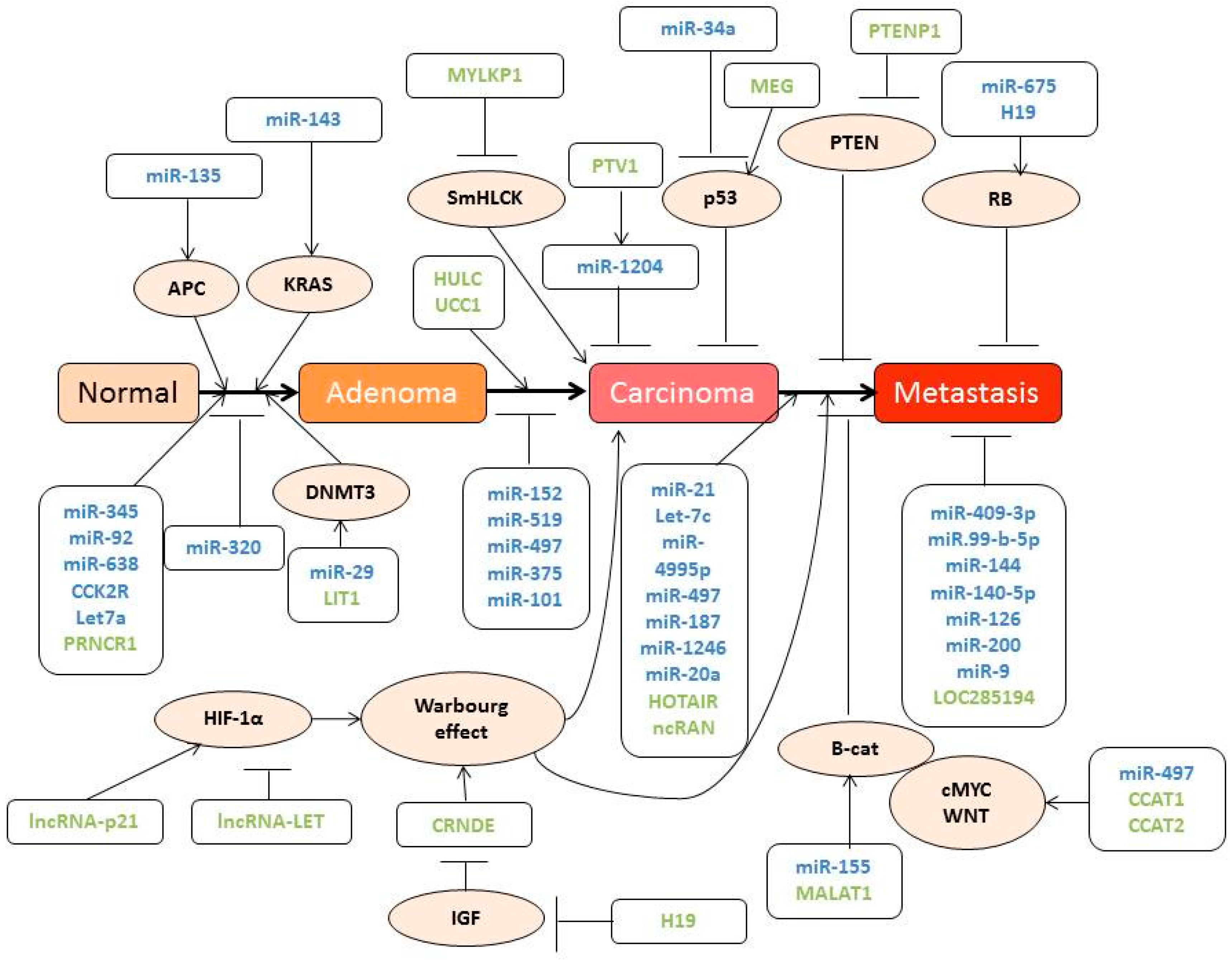 Schematic representation of the different miRNAs (blue) and lncRNAs (green) involved in colorectal carcinogenesis. Arrow-headed lines indicate protein activation whereas bar-headed lines represent protein inhibition.