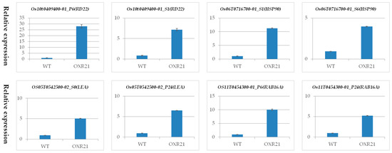 To validate the expression profiles of genes in RNA-seq results, we performed qRT-PCR on a few DEGs, including stress responsible genes, RD22 (Os10t0409400-01), heat shock protein (HSP90, Os06t0716700-01), LEA protein (Os05t0542500-02), RAB16A (Os11t0454300-01), catalase (CAT, Os06t0727200-02) and submergence-induced protein 2 (Sip2, Os10t0419400-01); transcriptional factors, dehydration responsive element binding protein 1F (DREB1F, Os04t0549700-01), MYB48 (Os01t0975300-01) and NAC134 (Os12t0156100-01); and serine-threonine kinase, CBL-interacting protein kinase 14 (CIPK14, Os12t0113500-01). The qPCR outcomes correlated closely with the transcript abundances estimated from the RNA-seq output, and all the confirmed qPCR results in Figure 5 supported the defense mechanisms against drought and salinity in transgenic plants.