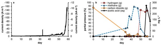 (a) current plot of the −900 mV vs. Ag/AgCl controlled biocathode throughout 57 days of operation; (b) Headspace composition throughout the experiments showed gradually increasing methane partial pressures, accompanied by decreasing levels of carbon dioxide. In the last phase of the experiment, hydrogen replaced all other gases and subsequently acetate formation took place.