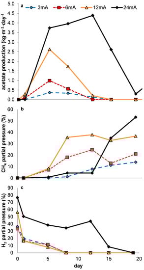 Four cathode electrode potentials were selected based on thermodynamics, and this is further explained in the Materials and Methods section. The three cells with the least negative cathode potential (−560, −630 and −700 mV) showed neither current nor acetate production during 34 days of operation. For this reason, these experiments were then ended and their results are not further reported on here. The fourth, most negative cathode potential (−900 mV) showed increasing current during this period, and concomitantly measurable amounts of reduction products were produced. The development throughout the experiment of current, acetate concentration and partial pressures of methane, carbon dioxide and hydrogen as measured in the headspace gas composition of this last cell are displayed in Figure 2.