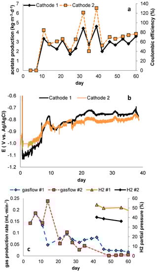 Results obtained in duplicate current controlled cathodes operated at 24 mA (11 A·m−2) containing 10 mM of 2-bromoethanosulfonate (2-BES) in the electrolyte; (a) Acetate production steadily increased throughout the experimental run of 60 days, reaching nearly 4 kg∙m−3∙day−1 at a Coulombic efficiency of 80% at the end of the experiment; (b) The development of cathode potential over time displayed a steep increase at first, followed by a more stable operation around −800 mV; (c) Starting at measurable fluxes, gas production gradually decreased for both cells—as an increasing share of current was directed towards production of acetate—and reached the detection limit by the end of the experiment.