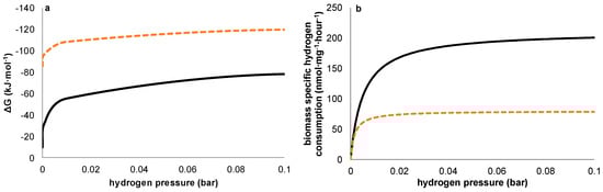 Shows the effect of variable hydrogen pressures on the competition between acetogens and methanogens both in terms of (a) Gibbs free energy of reaction [12]; and (b) biomass specific substrate consumption rate (Monod parameters for modelling growth were taken from reported values in Kotsyurbenko et al. [21]). As can be seen, methanogens have a thermodynamic advantage over homoacetogens throughout the whole domain. This thermodynamic advantage is reflected in the growth curves through the hydrogen affinity (Ks) for methanogens in general being lower than for acetogens. However, acetogenesis achieves higher conversion rates at higher hydrogen partial pressures (µmax) compared to methanogenesis, rendering hydrogen pressure an essential parameter to steer competition between acetogens and methanogens [21].