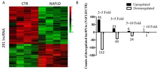 Using microarray analysis, 291 lncRNAs were found to be deregulated in NAFLD (Figure 1A, Table S1), 111 lncRNAs were upregulated and 180 lncRNAs were downregulated (Figure 1B).