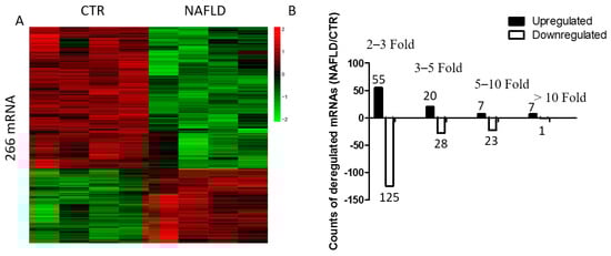 Microarray result of mRNA profile in NAFLD. (A) Heat map of differentially expressed mRNAs in control and NAFLD mice. Each row shows relative levels of each mRNA expression and each column represents expression levels for a single sample. Relative high (red) or low (green) expression is indicated; (B) Expression profiling of mRNAs in NAFLD and control mice. Determination of upregulated and downregulated mRNAs was based on more than two-fold changes of the normalized probe signal intensity in NAFLD compared with control. Black bars represent the number of upregulated mRNAs, whereas white bars represent the number of downregulated mRNAs.