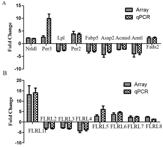 Fold change in mRNA (A) and lncRNA levels (B) inNAFLD compared with control mice, by microarray and quantitative polymerase chain reaction (qPCR) analyses. Bars above the x-axis indicat that genes are upregulated, and bars below the x-axis indicat that genes are downregulated. Data are presented as the mean ± standard deviation (SD). No significant differences were found for any genes assessed either by array or qPCR.Nr1d1, nuclear receptor subfamily 1, group D, member 1; Per3, period circadian clock 3; Lpl, lipoprotein lipase; Per2, period circadian clock 2; Fabp5, fatty acid-binding protein 5; Asap2, Acmsd, Arf-GAP with SH3 domain, ankyrin repeat and PH domain 2; Arntl, aryl hydrocarbon receptor nuclear translocator-like; Fads2, fatty acid desaturase; FLRL, fatty liver related lncRNA.