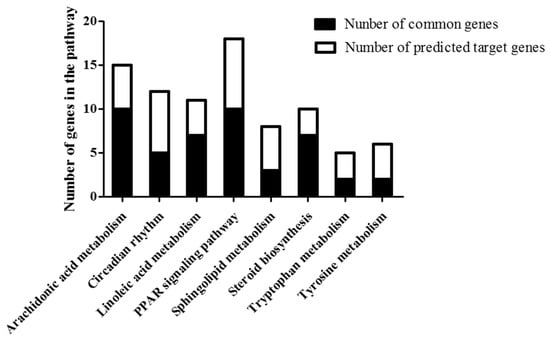 To exclude false negative or false positive results, interplay between target genes of lncRNA and genes identified by mRNA microarray were analyzed. Interestingly, several signaling pathways, such as arachidonic acid metabolism, circadian rhythm, linoleic acid metabolism, PPAR signaling pathway, sphingolipid metabolism, steroid biosynthesis, tryptophan metabolism and tyrosine metabolism were significantly changed in NAFLD in both lncRNA target analysis and mRNA enrichment analysis (Figure 4). These eight pathways included 39 predicted lncRNA targets and 46 mRNAs and 39 of them overlapped. Interestingly, among all 39 predicted lncRNA targets, four from circadian rhythm pathway and three from PPAR signaling pathway are cis, and the rest are trans. As for these 39 targets, 35 changed in the same direction as their lncRNA, and four were conversely regulated compared with their lncRNA. However, target prediction did not show the direction of these changes, which means that each lncRNA can have either an inhibitory or a promotive effect on its targets, whether in trans or cis. It appears that most of the lncRNA analyzed here tend to regulate their target genes positively. So, concerns emerged that the overlapping of these pathways may be caused by the regulatory effect of changed lncRNAs targeting certain mRNAs.