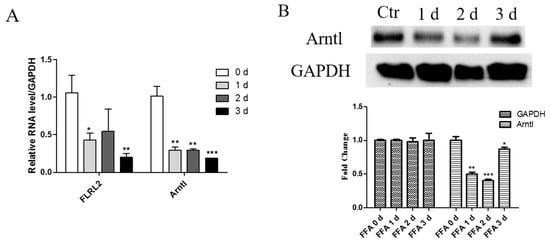 Decreased expression of fatty liver related lncRNA 2 (FLRL2) and aryl hydrocarbon receptor nuclear translocator-like (Arntl) in NAFLD cellular model. AML12 cells were treated with 1 mM free fatty acids (FFAs) for 1, 2, and 3 days (d) or 5% bovine serum albumin (BSA) as control. Cell extracts of total RNA (A) and protein (B) were collected and then tested accordingly. Expression of Arntl and FLRL2 were normalized to glyceraldehyde 3-phosphate dehydrogenase (GAPDH) in qPCR analysis. Data are presented as the mean ± SD.* p < 0.05; ** p < 0.01; *** p < 0.001.