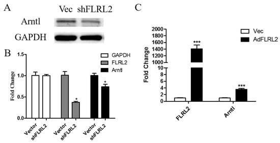 FLRL2 knockdown downregulates predicted target Arntl expression and vice versa. shFLRL2 plasmids and empty vectors as a control were transfected in AML12 cells for 48 h. Cell extracts were prepared for Western blot (A) and qPCR (B); FLRL2 overexpression vector, AdFLRL2 plasmid was transfected and total RNA were extracted after 48 h (C). mRNA levels of FLRL2 and Arntl were measured by qPCR and presented as the mean ± SD relative to the levels of control cells from three experiments. * p < 0.05; *** p < 0.001.