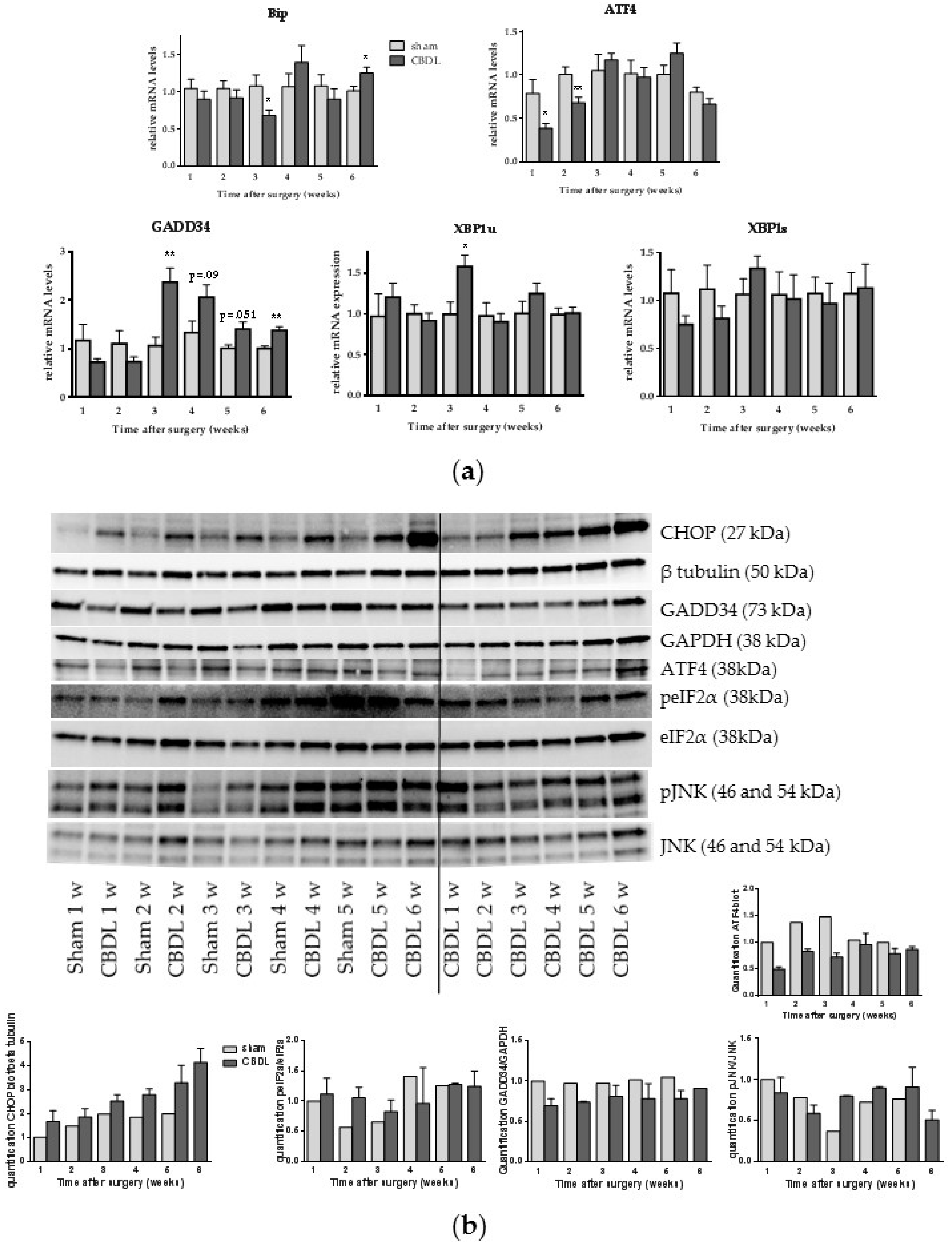 In order to study the hepatic UPR and cell death during the time course of biliary fibrosis following CBDL, male Swiss mice were euthanized on a weekly basis, for six consecutive weeks, starting at week 1 after surgical induction (6 sham and 6 CBDL groups, 7–14 animals in each group). At sacrifice, liver samples were immediately harvested into liquid nitrogen and kept at −80 °C for protein and mRNA extraction. A portion was fixed in 4% formaldehyde for 24 h and imbedded in paraffin for histological analysis.