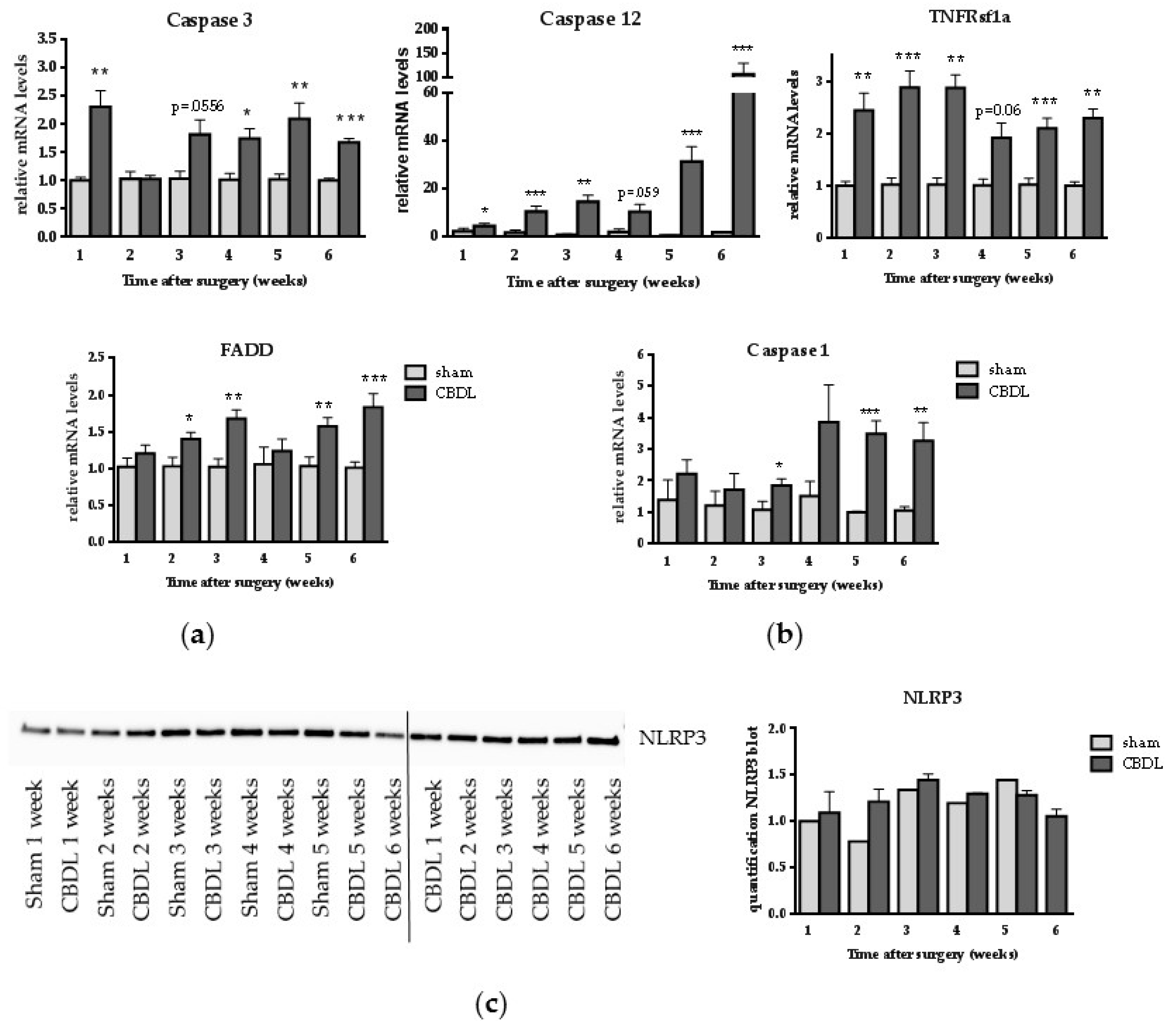 Since previous reports described the involvement of apoptosis in cholestatic liver damage and as CBDL was associated with induction of the pro-apoptotic ER stress marker CHOP in our study, we evaluated the expression of caspase 3, executor of both the intrinsic and extrinsic apoptotic pathway, ER stress-induced caspase 12, and tumor necrosis factor receptor superfamily member 1a (TNFRsf1a) and Fas-Associated protein with Death Domain (FADD), two markers involved in extrinsic apoptotic cell death. Caspase 3 mRNA expression was significantly upregulated starting at week 1 (with the exception of weeks 2 and 3), and caspase 12 was significantly increased at all timepoints after CBDL, compared to sham surgery (Figure 2a). TNFRsf1a and FADD were upregulated at all timepoints in CBDL mice compared to their matching control group (Figure 2a). Besides apoptosis, the possible involvement of inflammasome activation, which results in pyroptotic cell death, was assessed by measuring caspase 1 and nucleotide-binding, leucine-rich repeat and pyrin domains-containing protein 3 (NLRP3) inflammasome levels. Although caspase 1 gene expression was increased from week 3 until week 6 in CBDL mice (Figure 2b), no increase in NLRP3 protein expression was demonstrated (Figure 2c).