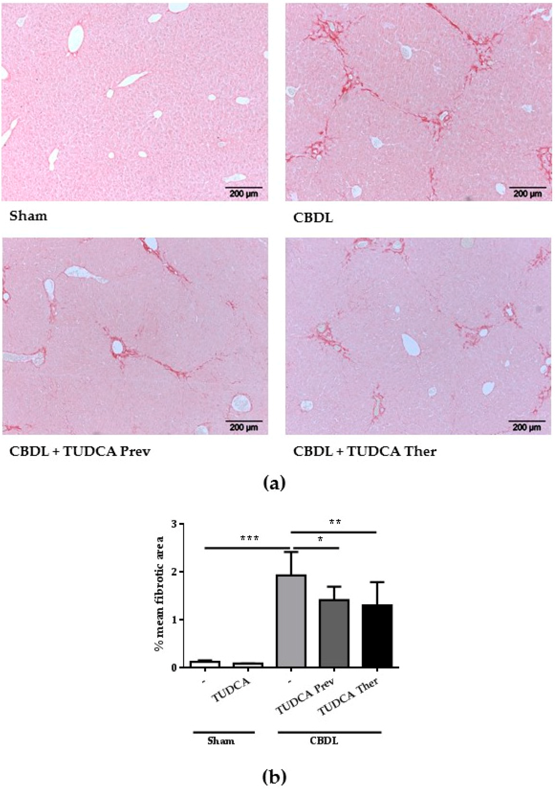 Treatment with TUDCA reduces the degree of liver fibrosis: (a) Representative histological images of livers from a sham mouse, a CBDL control and CBDL mice treated with TUDCA, stained with Sirius red. Original magnification 100×; (b) Computerized quantification of fibrosis scores (mean fibrotic area (%) ± SD). * p < 0.05, ** p < 0.01, *** p < 0.001.