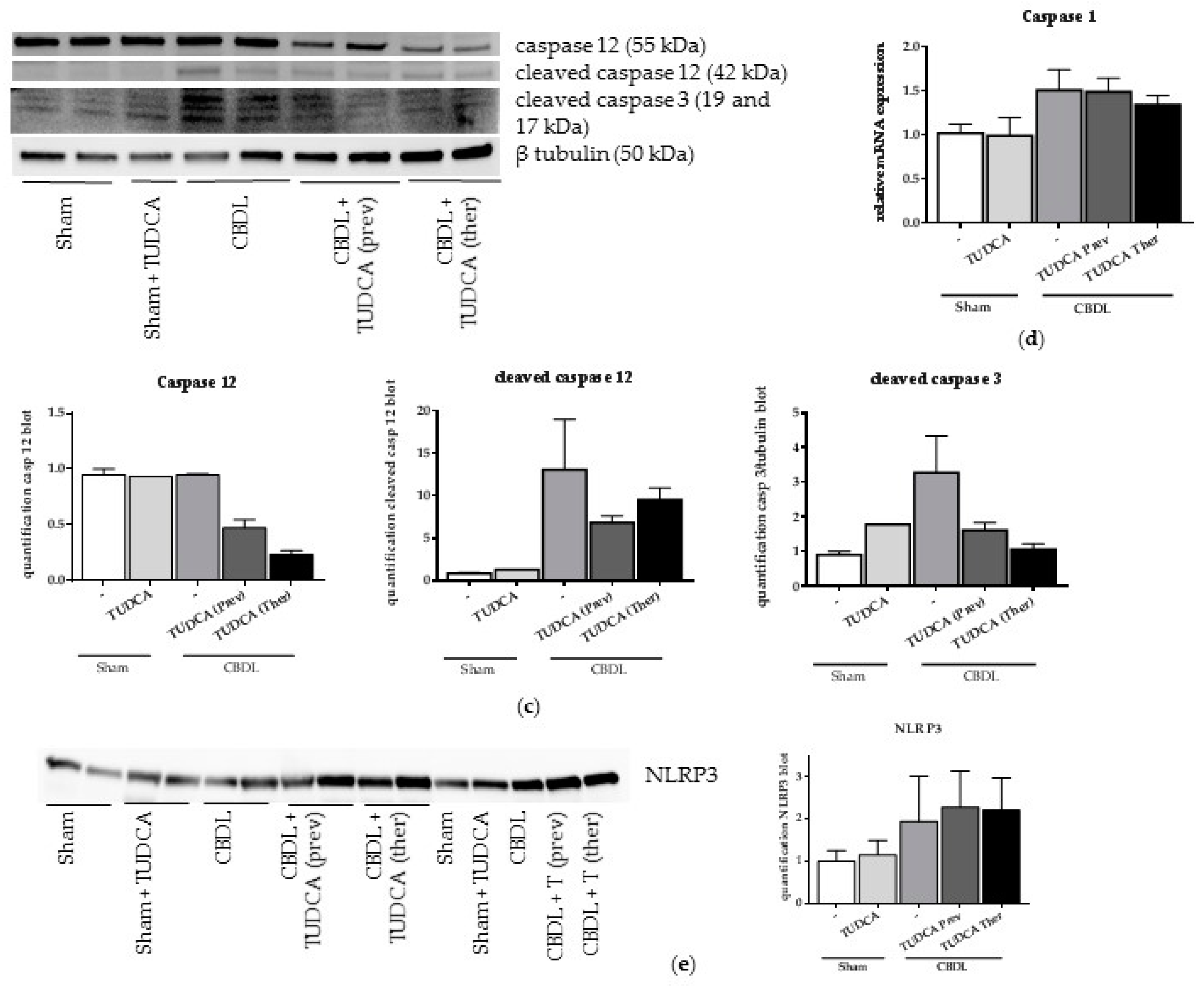 In order to explore whether TUDCA exerts its beneficial effect on liver damage and fibrosis through a reduction in pro-apoptotic UPR signaling, UPR-induced CHOP expression and gene and protein expression of different pro-apoptotic markers after TUDCA treatment was studied. Western blot analysis confirmed the induction of the pro-apoptotic transcription factor CHOP at 6 weeks after CBDL and demonstrated reduced CHOP expression when TUDCA was given preventively (Figure 4a). Preventive supplementation with TUDCA also significantly reduced mRNA levels of caspase 3 and both preventive and therapeutic TUDCA treatment reduced cleaved caspase 3 and cleaved caspase 12 protein levels, compared to the CBDL controls (Figure 4b,c). TNFRsf1 expression was only decreased in the preventive setting whereas FADD was significantly lower following the preventive and therapeutic TUDCA treatments. Although an increased trend was observed in the CBDL and therapeutic TUDCA group, the anti-apoptotic Bcl2, was not significantly altered after the CBDL or TUDCA treatment (Figure 4b). No effect of TUDCA, neither preventively nor therapeutically, was seen on caspase 1 gene expression in CBDL mice nor on NLRP3 levels (Figure 4d,e).