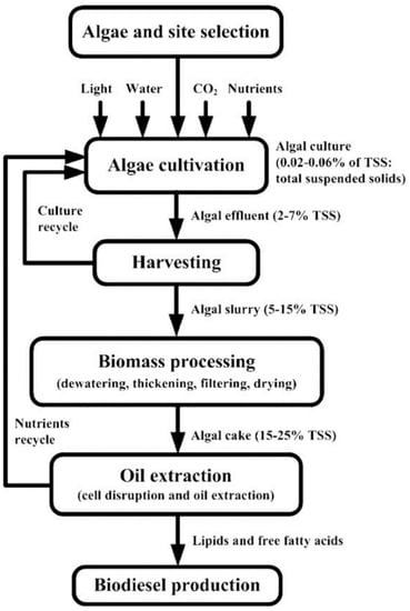 Stages of microalgae from cultivation to biofuel production. Used with permission from [14].