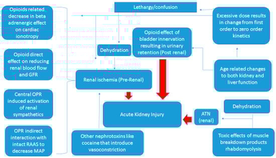 Mechanism of opioid-related kidney failure: pre-renal, acute tubular necrosis and post-renal failure. GFR: glomerular filtration rate; MAP: mean arterial pressure; OPR: opioid peptide receptors; RAAS: renin–angiotensin–aldosterone system; ATN: acute tubular necrosis. Red arrows show the final pathway to acute kidney injury.
