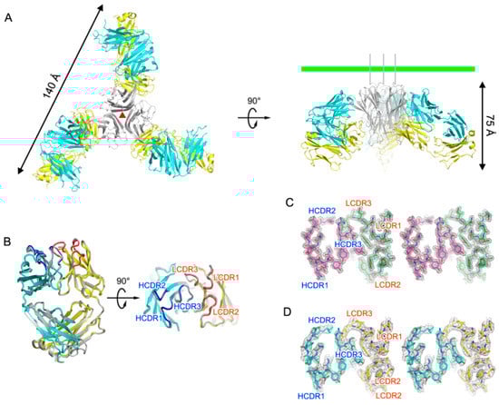 Overall structure of TNFα in complex with the certolizumab Fab fragment. (A) Ribbon representation of TNFα (gray) in complex with the certolizumab Fab fragment (heavy chain: cyan; light chain: yellow) in two orientations. The 3-fold axis in the trimeric complex is indicated as a red triangle. The green bar indicates a putative membrane of a TNFα-producing cell if the TNFα trimer is a precursor form of transmembrane TNFα; (B) Superposition of the free certolizumab Fab fragment (gray) onto the Fab fragment extracted from the TNFα-certolizumab complex (heavy chain: cyan; light chain: yellow; heavy chain complementary-determining regions: blue; light chain complementary-determining regions: red); (C) Cross-eyed stereoview of the 2fo-fc composite omit map (1.2 σ contour level) at the complementary-determining regions (CDRs) of the free certolizumab Fab fragment, calculated at 1.95 Å resolution (heavy chain: purple; light chain: green); (D) Cross-eyed stereoview of the 2Fo-Fc composite omit map (1.2 σ contour level) at the CDRs of the Fab fragment in the TNFα-certolizumab complex, calculated at 2.89 Å resolution (heavy chain: cyan; light chain: yellow).