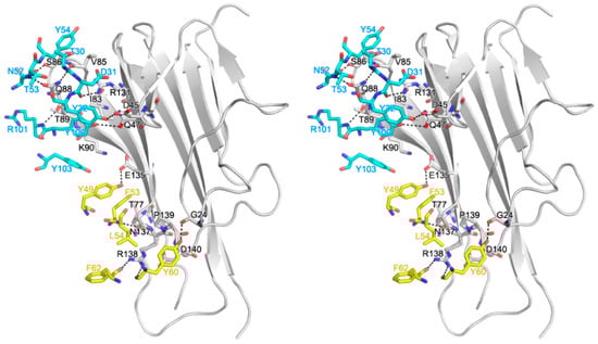 The interaction of a single Fab fragment of certolizumab with TNFα buried a total solvent-accessible area of 1887 Å2, which was larger than a typical protein–protein interface (1560–1700 Å2) [38], and thereby contributed to the high affinity between TNFα and certolizumab (Figure 2) [39]. Although TNFα exists as a trimer, the epitope of certolizumab was composed of only residues from a single protomer of TNFα. The certolizumab epitope of TNFα consisted of a number of residues, including TNFαG24, TNFαD45, TNFαQ47, TNFαT77, TNFαI83, TNFαV85, TNFαS86, TNFαQ88, TNFαT89, TNFαK90, TNFαR131, TNFαE135, TNFαN137, TNFαR138, TNFαP139, and TNFαD140, and most were located in the DE loop and GH loop regions of TNFα. Several residues on the epitope of certolizumab were also involved in the TNFα–TNFR interaction [35], indicating the mechanism by which certolizumab competitively blocks the TNFα–TNFR interaction.