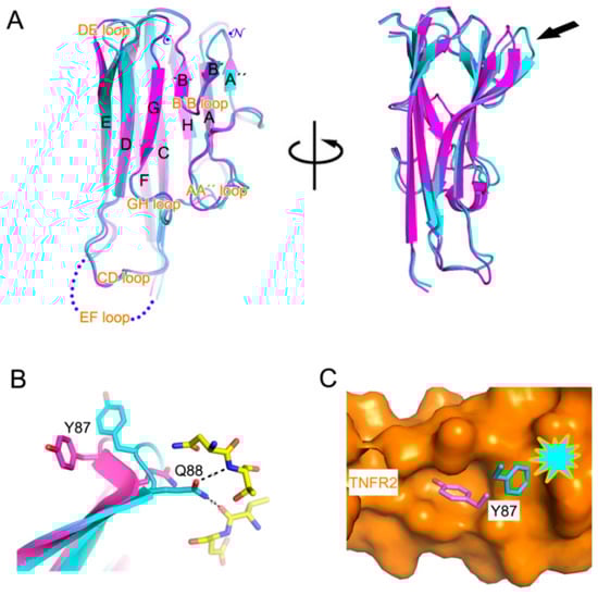 Conformational change of the DE loop. (A) Superposition of the TNFα protomers extracted from the TNFα-certolizumab complex (cyan) and the TNFα–TNFR2 complex (purple) in two orientations. The strands, loops, N-, and C-terminus of TNFα are labelled. The arrow indicates the discrepancy of the DE loop conformation; (B) Conformational change of the DE loop induced by certolizumab binding. The bidentate hydrogen bond by TNFαQ88 with certolizumab (yellow) changes the DE loop conformation; (C) Steric collision of TNFαY87 with TNFα is represented in the case of the DE loop conformation altered by certolizumab binding. The surface of TNFR2 is colored orange.