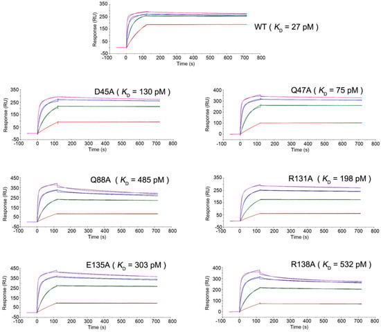 Sensorgrams for the binding kinetics of the TNFα mutants. Surface plasmon resonance analyses of wild-type and mutant TNFα, demonstrating their binding affinities to certolizumab Fab fragments. The concentrations of the wild-type and mutant TNFα for each experiment are 2 (red), 10 (green), 50 (blue), 250 nM (purple).