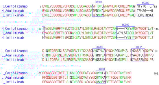 Sequence comparison of the antibodies against TNFα. The CDRs are indicated with boxes and labeled. The residue numbers refer to those in certolizumab. The identical and homologous residues are colored red and green, respectively.