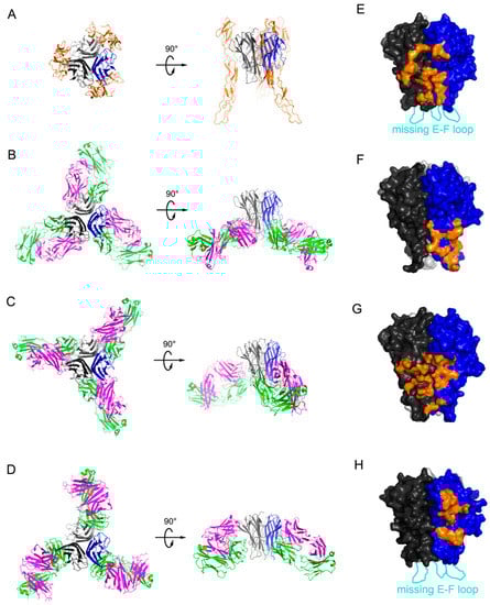 A comparison of the interface between TNFα and the TNFα blockers. (A) The structure of the TNFα trimer (black, gray, and blue) in complex with TNFR2 (orange); (B) The structure of the TNFα trimer (black, gray, and blue) in complex with the infliximab Fab fragment (heavy chain: purple; light chain: green); (C) The structure of the TNFα trimer (black, gray, blue) in complex with the adalimumab Fab fragment (heavy chain: purple; light chain: green); (D) The structure of the TNFα trimer (black, gray, blue) in complex with the certolizumab Fab fragment (heavy chain: purple; light chain: green); (E) The TNFR2 binding site on the surface of the TNFα trimer (black and blue for each protomer) is colored orange; (F) The infliximab epitope on the surface of the TNFα trimer (black and blue for each protomer) is colored orange; (G) The adalimumab epitope on the surface of the TNFα trimer (black and blue for each protomer) is colored orange; (H) The certolizumab epitope on the surface of the TNFα trimer (black and blue for each protomer) is colored orange. The EF loop, which is missing in the structures of TNFα–TNFR2 and the TNFα-certolizumab complex owing to a lack of interactions, is labeled.
