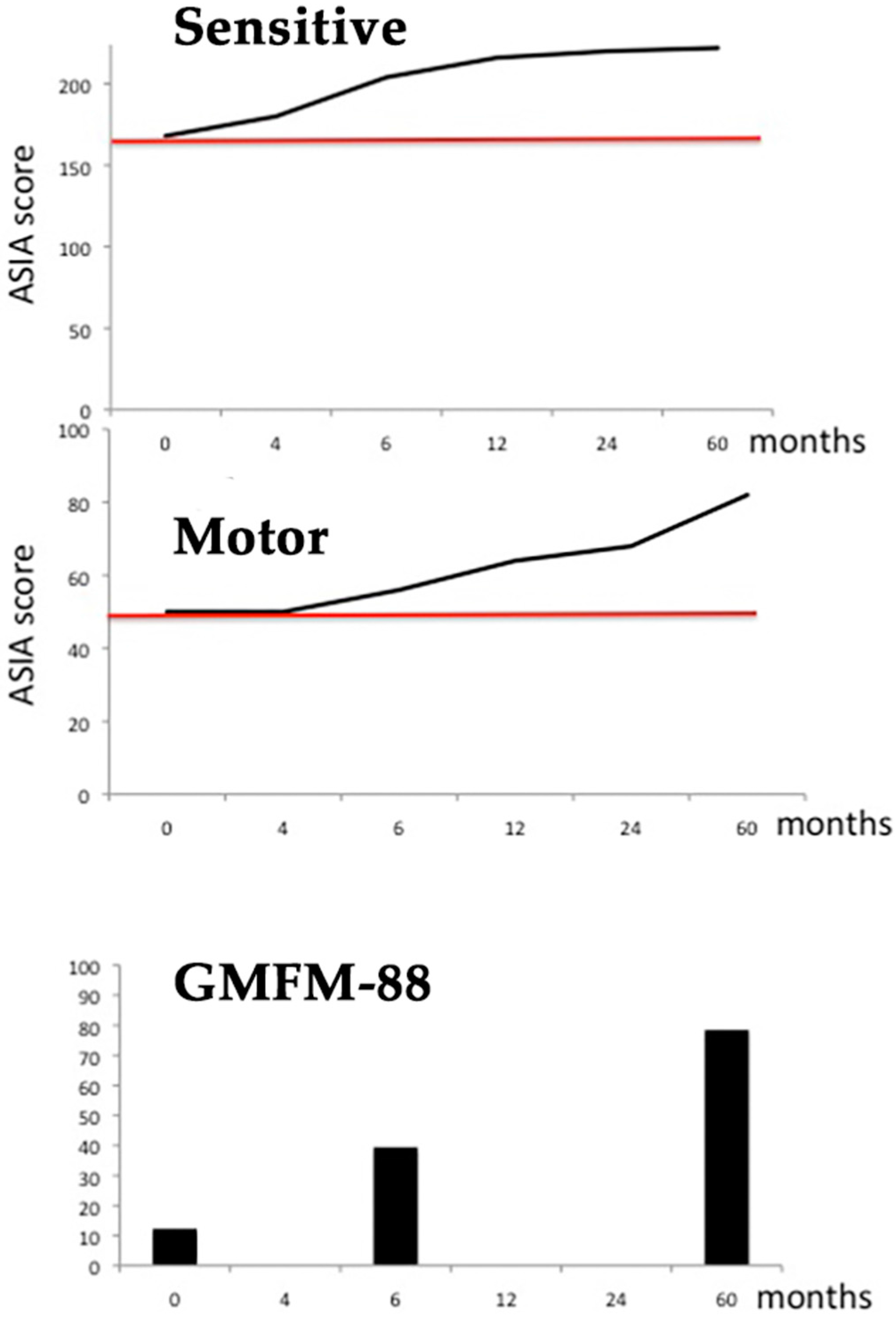 In summary, after 5 years of treatment, significant sensorial and motor improvements had been reached; the last GMFM-88 test performed revealed a score of 78.48% (maximum = 100). This means that, despite the SC having been interrupted at the L2–L3 level (