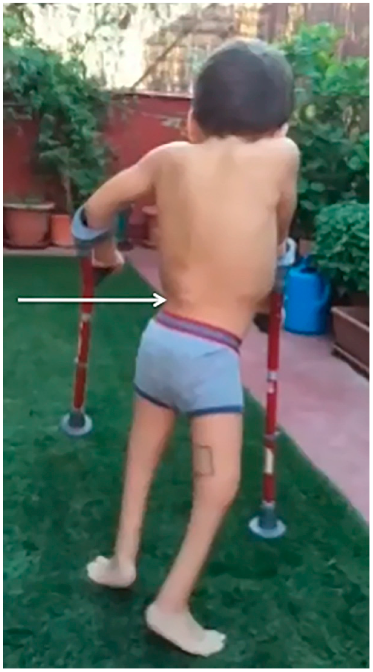 Three years after commencing the treatment, the patient was able to walk with crutches, although the lack of the sacrum produced a flexion of the hips while walking. Note that the muscles of the legs still lacked development, while there was an increase in the mass of the quadriceps and ischio-tibialis. Clubfoot persists. The white arrow shows where the vertebral column ends, as indicated by a bulging bone in the back.