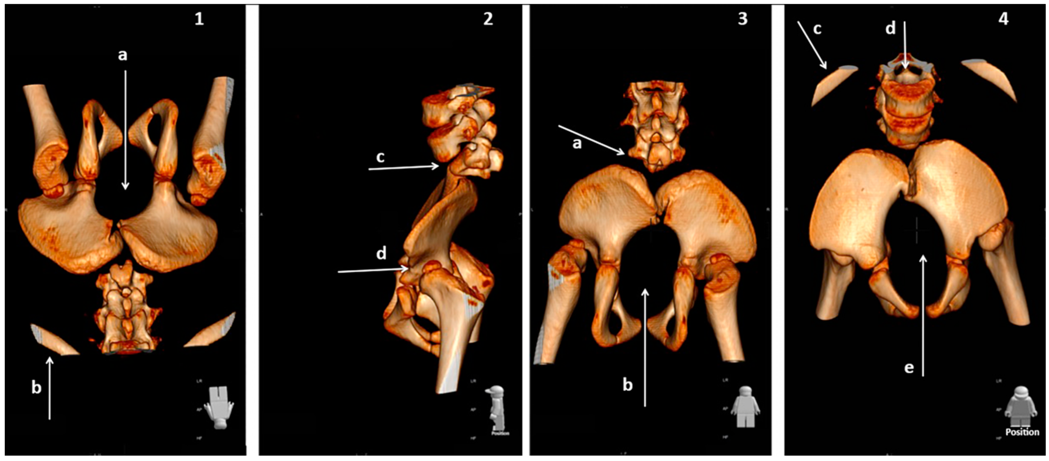 Figure 5 shows, vertebral development had been interrupted at the L2–L3 level. The sacrum did not exist, the iliac bones were articulated in the midline, the hips were rotated, the development of both acetabulae had been incomplete, and both femoral heads were luxated.