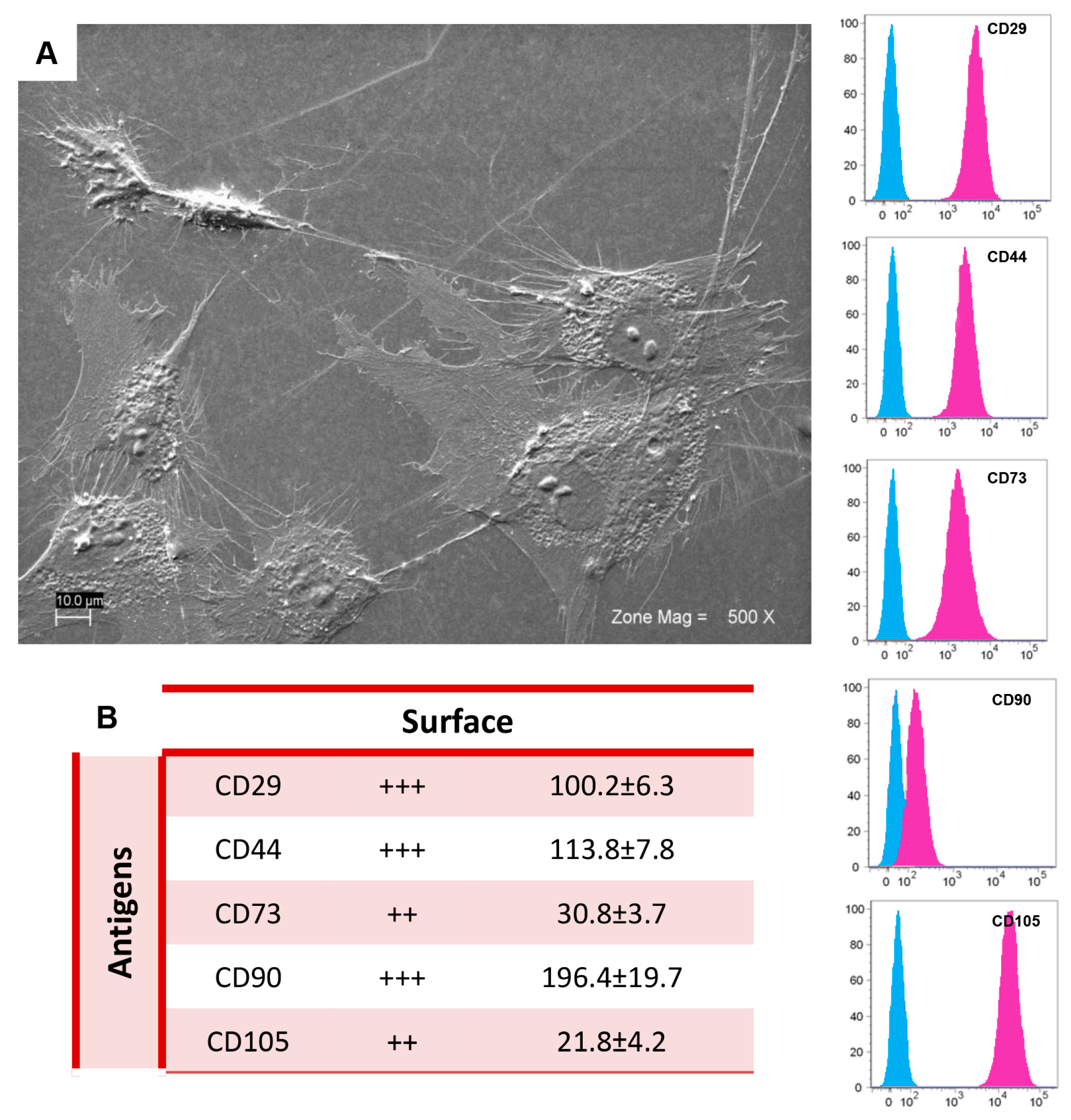 GMSCs characterization: (A) Ultrastructural morphology of GMSCs observed at scanning electron microscopy. Cells showed characteristic fibroblast-like morphology with several filopodia that make a contact with neighbouring cells. Magnification: 500×; (B) Cytofluorimetric determination of GMSCs-related antigens. The blue histogram shows the distribution of the antigen expression, whereas the pink histogram represents the respective control. The values are expressed as mean fluorescence ratio (MFI), obtained by dividing the MFI of positive events by the MFI of negative events. Numeric values of MFI ratio are the mean ± SD. ++: medium expression; +++: high expression; MFI ratio is the average of different biological samples (n = 5) and standard deviation.