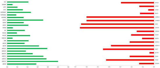 AD-related genes differentially expressed between CBD-GMSCs and CTR-GMSCs. The fold change is expressed in log10 (q ≤ 0.05, Benjamini–Hochberg False Discovery Rate). Upregulated genes are shown in green, while downregulated ones are in red.