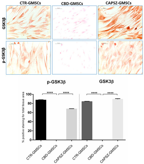 Immunostaining for GSK3β and p-GSK3β. CTR-GMSCs showed positive staining for both GSK3β and p-GSK3β, whereas CBD-GMSCs showed negative expression. GMSCs pre-treated with Capsazepine/TRPV1 antagonist (CAPSZ-GMSCs) were positive for GSK3β and p-GSK3β; CTR-GMSCs vs. CBD-GMSCs **** p < 0.0001; CBD-GMSCs vs. CAPSZ-GMSCs **** p < 0.0001. Densitometric analysis was carried out on 3/6 coverslips by covering about 90% of the total area for each experimental group. Objective: 40×, bar length: 50 μm.