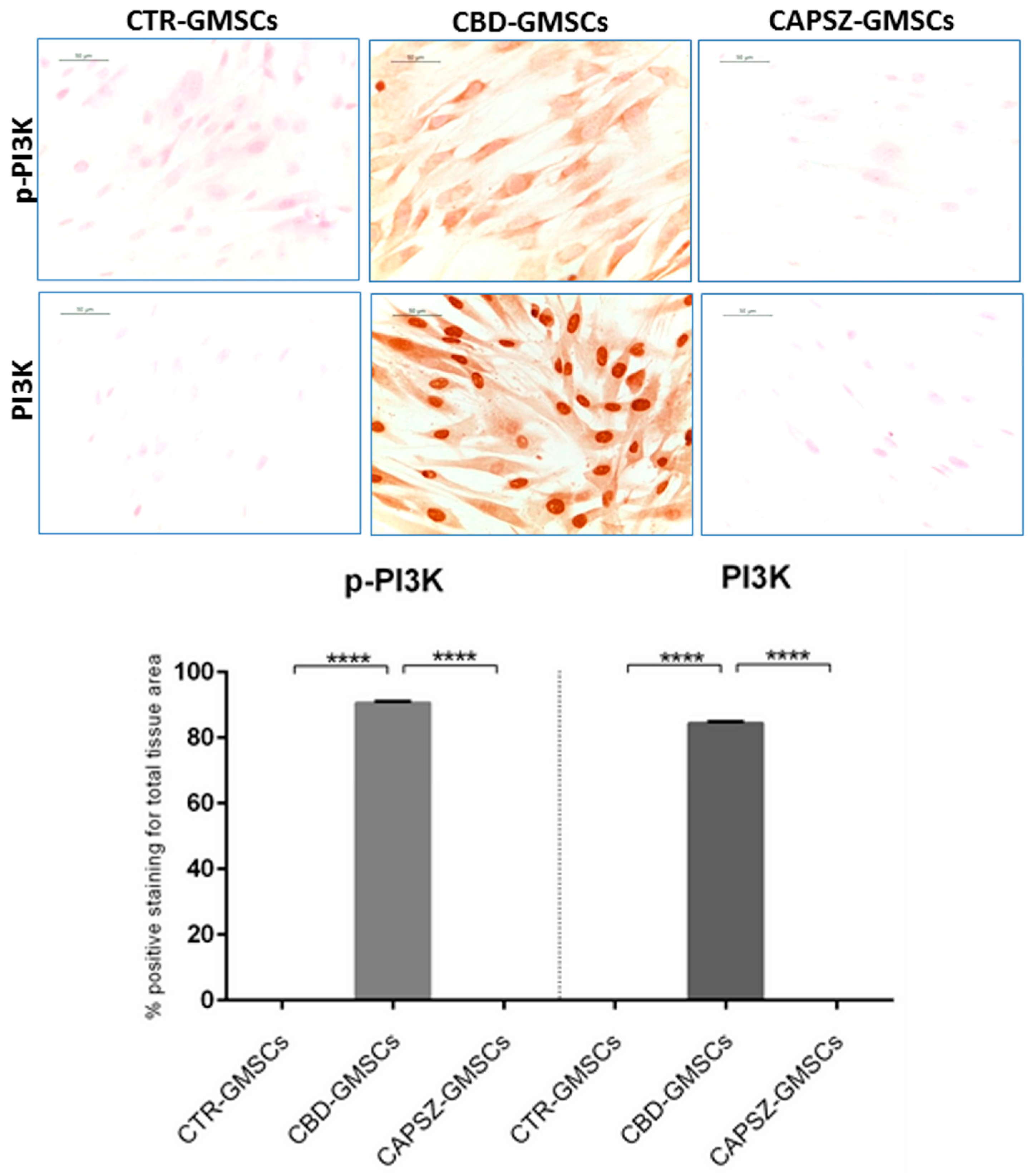 Immunostaining for p-PI3K and PI3K. CBD-GMSCs showed positive staining for p-PI3K and PI3K. On the other hand, CTR-GMSCs and showed negative expression for these proteins. The expression of p-PI3K and PI3K was abolished by pre-treatment of GMSCs with Capsazepine/TRPV1 antagonist (CAPSZ-GMSCs); CTR-GMSCs vs. CBD-GMSCs **** p < 0.0001; CBD-GMSCs vs. CAPSZ-GMSCs **** p < 0.0001. Densitometric analysis was carried out on 3/6 coverslips by covering about 90% of the total area for each experimental group. Objective: 40×, bar length: 50 μm.