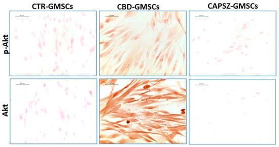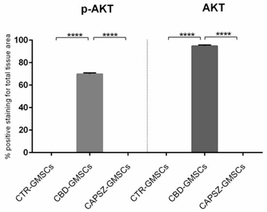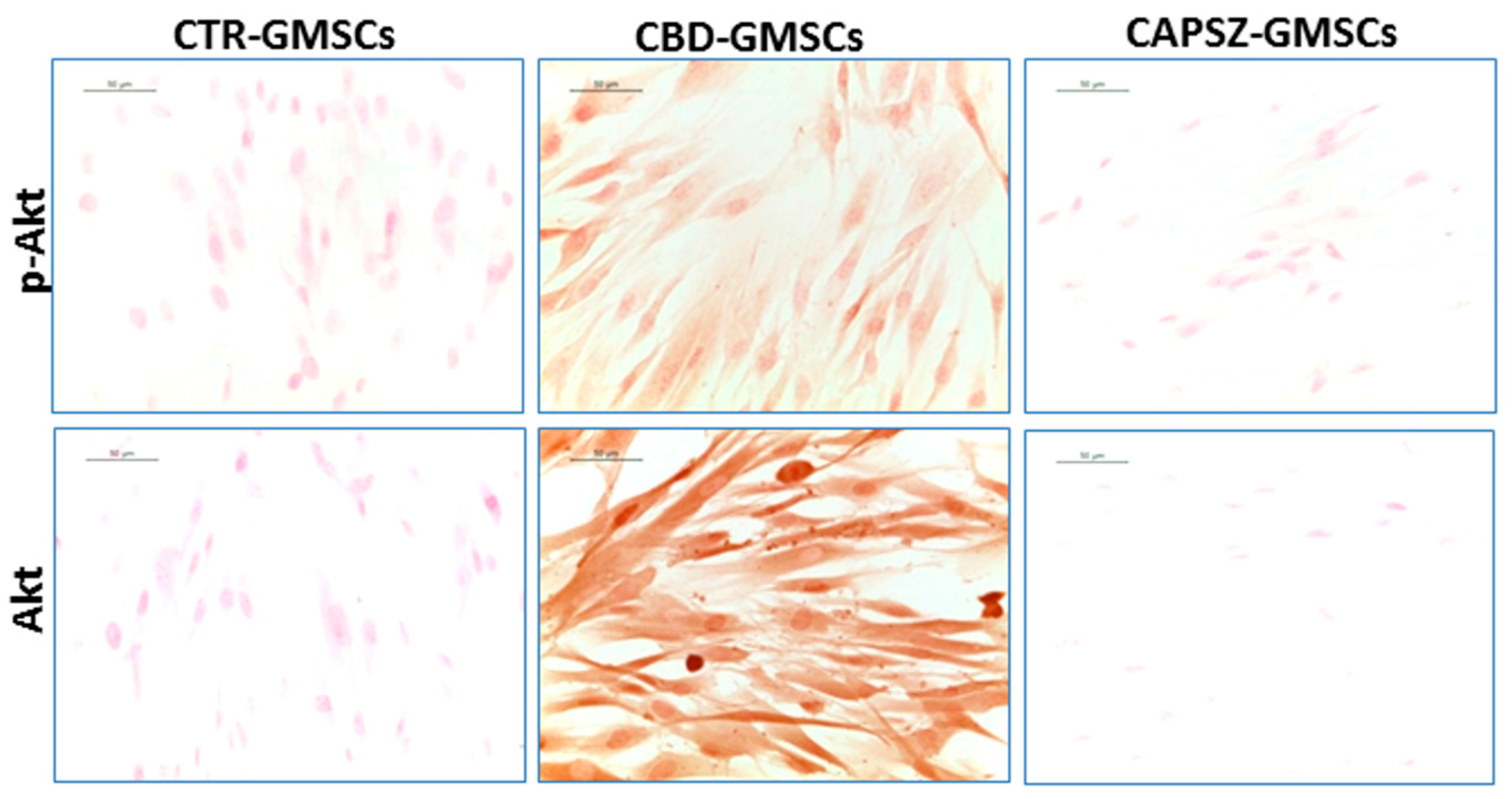 Immunostaining for p-Akt and Akt. CBD-GMSCs showed positive staining for p-Akt and Akt, whereas CTR-GMSCs and showed negative expression for these proteins. The expression of Akt and p-Akt was abolished by pre-treatment of GMSCs with Capsazepine/TRPV1 antagonist (CAPSZ-GMSCs); CTR-GMSCs vs. CBD-GMSCs **** p < 0.0001; CBD-GMSCs vs. CAPSZ-GMSCs **** p < 0.0001. Densitometric analysis was carried out on 3/6 coverslips by covering about 90% of the total area for each experimental group. Objective: 40×, bar length: 50 μm.