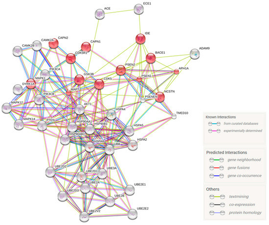 Protein association networks. The protein association network retrieved from STRING using the AD-related genes differentially modulated by CBD in GMSCs. The network circles represent proteins. The lines between the circles show the functional association. Co-expression evidence: black; database evidence: light blue; text mining evidence: yellow; experimental evidence: purple; co-occurrence evidence: blue; neighbourhood evidence: green; fusion evidence: red. The pink circles represent genes statistically correlated to the Alzheimer’s Disease pathway, according to the KEEG database, FDR = 4.19 × 1015.
