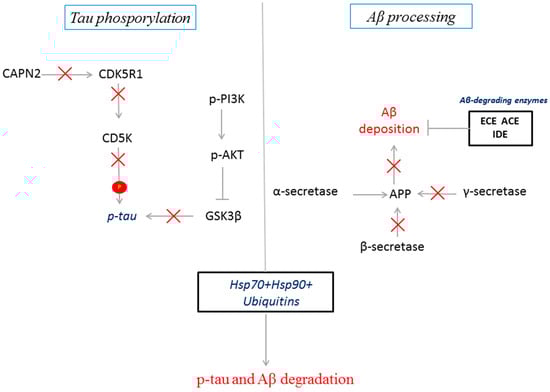 Moreover, the genes coding for the secretases involved in Aβ production, such as the β-(BACE-1) and γ-secretases (PSEN1, PSEN2, NCSTN, PSENEN, and APH1A), were found to be downregulated in CBD-GMSCs, while the genes coding for enzyme involved in Aβ degradation (ACE1, ECE1, and IDE) were upregulated (Figure 2; Table 2). The mRNA expression of genes coding for different heat shock proteins (HSPs), such as the HSP70s (HSPA2, HSPA4, HSPA5, and HSPA8) and the HSP90s (HSP90AA1, HSP90AB1, and HSP90B1), as well as the genes coding for members of the ubiquitin system and the ubiquitin-conjugating enzymes (UBE2D1, UBE2D2, UBE2D3, UBE2E1, UBE2E2, UBE2V2, and UBE3A) were increased in CBD-GMSCs. Moreover, we found an upregulation of the genes coding for the PI3K subunits (PIK3CA and PIK3CB) and for AKT1 in CBD-GMSCs. Conversely, in Table 1 and Table 2, apart from the AD genes differentially regulated among CTR-GMSCs and CBD-GMSCs, we have also indicated the gene ontology (GO) annotations, the gene expression levels (Exp_Value), the Fold Change (FC), and the False Discovery Rate (FDR) for each gene considered. Raw data of gene expression analysis are available in Table S1.