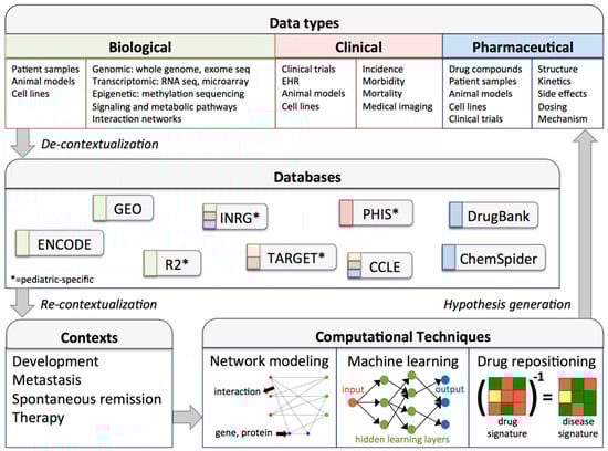 Data-driven research workflow for neuroblastoma or other pediatric cancers. The data types panel enumerates data sources (e.g., animal models) and types (e.g., RNA sequencing) for three categories of biological data. Following collection, data may be de-contextualized for inclusion in databases. De-contextualization involves properly formatting and annotating datasets, so that they are standardized, accessible, and useful for re-contextualization into new research contexts. Note that this workflow is iterative, and can therefore benefit from continued improvement of data infrastructure and data collections, development of more accurate and comprehensive data analysis tools, and advances in basic and translational research and therapeutic applications [,,,,,,,]. CCLE, cancer cell line encyclopedia; ENCODE, encyclopedia of DNA elements; GEO, gene expression omnibus; EHR: electronic health record; INRG, international neuroblastoma risk group; PHIS, pediatric health information system; R2, genomics analysis and visualization platform; TARGET, therapeutically applicable research to generate effective treatments.