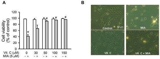 To investigate MIA exposure and vitamin C’s protective effects on cell viability of SW1353 cells, the cells were treated with or without 5 μM MIA and/or with different concentrations of vitamin C, as indicated, for 24 h, and then cell viability was assayed. As shown in Figure 1A, cell viability decreased with MIA exposure, while cell viability significantly increased with ≥50 μM vitamin C, even with MIA exposure. However, vitamin C did not increase cell viability in the absence of MIA exposure. Figure 1B shows that the morphology of 5 μM MIA- and 100 μM vitamin C-treated cells was not changed, and it was almost the same as the control, suggesting that vitamin C treatment efficiently protected against MIA-induced cell death.