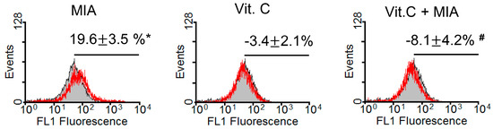 Effects of MIA and/or vitamin C on oxidative stress in SW1353 cells. SW1353 cells were incubated with 100 μM vitamin C in the presence or absence of 5 μM MIA for 8 h, and then production of reactive oxygen species was measured using 2′,7′-dichlorofluorescein diacetate (DCFH-DA) and flow cytometry. The percentages above the panel indicate the percentage of cells showing DCFH-DA fluorescence (reactive oxygen species generation) and are the mean ± S.D. for three separate experiments, each in triplicate. The gray filled area is the untreated control and those delimited by the red lines are the treated groups. * p < 0.05 compared to the untreated control group. # p < 0.05 compared to the MIA treated group.