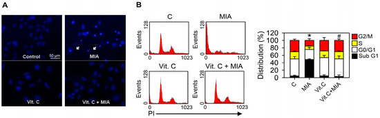 Effects of MIA and/or vitamin C on apoptosis induction and cell cycle progression. SW1353 cells were incubated with 100 μM vitamin C in the presence or absence of 5 μM MIA for 24 h, and then (A) apoptosis was determined by Hoechst 33342 staining; and (B) the distribution of cells in the different phases of the cell cycle was determined by flow cytometry. In (A), the white arrows indicate an apoptotic cell; in (B), the down panel indicates the percentage of cell cycle distribution. The results are expressed as the mean ± S.D. for three separate experiments, each in triplicate. * p < 0.05 compared to the untreated control. # p < 0.05 compared to the MIA treated group.