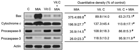 Effects of MIA and/or vitamin C on apoptosis-related protein expression. SW1353 cells were incubated with 100 μM vitamin C in the presence or absence of 5 μM MIA for 24 h, and then the cells were harvested. The proteins were extracted and Bax, cytochrome c, procaspase-9, and procasepase-3 were measured. β-actin was used as the internal control. The data of the right panel are expressed as the relative density compared to that in untreated cells (control), which was 100%. The results are the mean ± S.D. for three separate experiments. * p < 0.05 compared to the corresponding untreated control. # p < 0.05 compared to the corresponding MIA treated group.