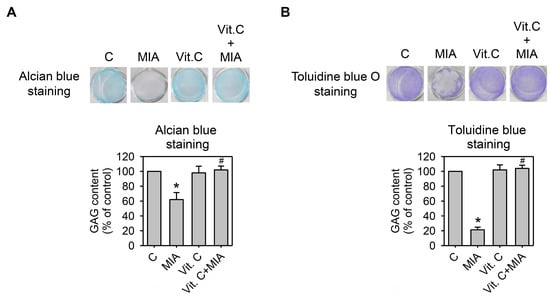 Effect of MIA and/or vitamin C on proteoglycan loss. SW1353 cells cultured in 24-well plates were incubated with 100 μM vitamin C in the presence or absence of 5 μM MIA for 24 h, and then the glycosaminoglycan (GAG) contents in the proteoglycan was determined by (A) alcian blue staining; or (B) toluidine blue O staining followed by colorimetric assay. The data of each down panel are expressed as the relative density compared to that in untreated cells (control), which was 100%. The results are the mean ± S.D. for three separate experiments. * p < 0.05 compared to the untreated control. # p < 0.05 compared to the MIA treated group.