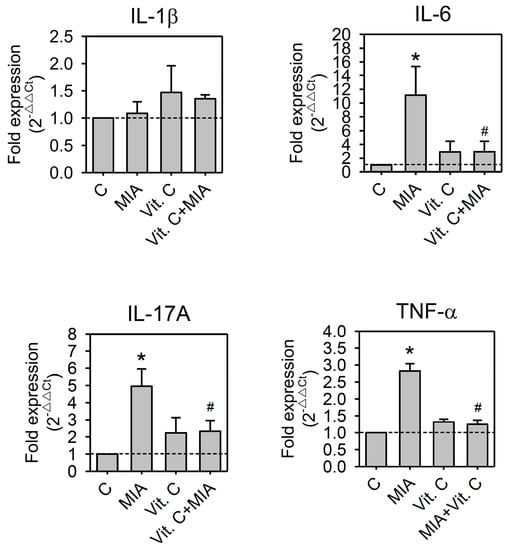 Effects of MIA and/or vitamin C on pro-inflammatory cytokine expressions. SW1353 cells were incubated with 100 μM vitamin C in the presence or absence of 5 μM MIA for 24 h; then, the cells were harvested and the mRNA was extracted, followed by reverse transcription and real-time PCR analysis for IL-1β, IL-6, IL-17A, and TNF-α. The data are expressed as fold changes compared to that in untreated control. The dashed line shows Y = 1 of control for reference. The results are the mean ± S.D. for three separate experiments, each in triplicate. * p < 0.05 compared to the untreated control. # p < 0.05 compared to the MIA treated group.