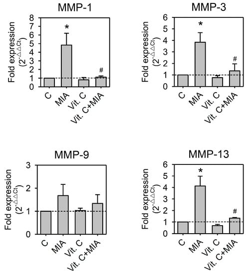 Effects of MIA and/or vitamin C on matrix metalloproteinase (MMP) expressions. SW1353 cells were incubated with 100 μM vitamin C in the presence or absence of 5 μM MIA for 24 h; then, the cells were harvested and the mRNA was extracted, followed by reverse transcription and real-time PCR analysis for MMP-1, MMP-3, MMP-9, and MMP-13. The data are expressed as fold changes compared to untreated control. The dashed line shows Y = 1 of control for reference. The results are the mean ± S.D. for three separate experiments, each in triplicate. * p < 0.05 compared to the untreated control. # p < 0.05 compared to the MIA treated group.