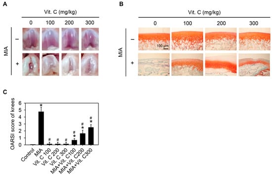 Effect of vitamin C on articular cartilage of rat with MIA-induced OA. The details of MIA-induced OA in rats and subsequent vitamin C treatment are described in the Materials and Methods. After vitamin C treatment for two weeks, the articular cartilage of rats was removed and (A) macroscopic observation or (B) histologic evaluation or (C) Osteoarthritis Research Society International (OARSI) score of each joint occurred, n = 10. * p < 0.05 compared to the untreated control. # p < 0.05 compared to the MIA treated group.