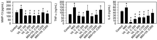 Effect of vitamin C on the serum levels of pro-inflammation cytokines and MMPs in rats with MIA-induced OA. The details of MIA-induced OA in rats and subsequent vitamin C treatment are described in the Materials and Methods. After vitamin C treatment for two weeks, serum levels of IL-6, TNF-α, and MMP-13 were analyzed by enzyme-linked immunoassay n = 10. * p < 0.05 compared to the untreated control. # p < 0.05 compared to the MIA treated group.