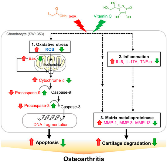 Schematic diagram of vitamin C effects on MIA-treated chondrocytes. The present study demonstrates that, upon 5 μM MIA exposure to SW1353 cells, ROS, Bax, and cytochrome c release are increased; however, procaspase-9 and procaspase-3 levels are decreased, indicating that caspase-9 and caspase-3 are activated, which leads to increased apoptosis of chondrocytes (1. Oxidative stress). Additionally, the expressions of pro-inflammation cytokines IL-6, IL-17A, and TNF-α (2. Inflammation), and MMPs MMP-1, MMP-3, and MMP-13 are increased (3. Matrix metalloproteinase), which may cause cartilage degradation. These contribute to the occurrence of osteoarthritis. Interestingly, all of these MIA-induced changes can be decreased with vitamin C treatment. Black solid lines indicated evidences found in this study, dashed lines indicated unknown involved actors. Red