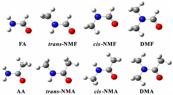 The stable structures of the monomers obtained at the B3LYP-D3/aug-cc-pVTZ level; FA: formamide; NMF: N-methylformamide; DMF: N,N-dimethylformamide; AA: acetamide; NMA: N-methylacetamide; DMA: N,N-dimethylacetamide.