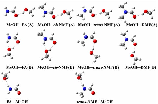 The thermal properties were calculated at the B3LYP-D3/aug-cc-pVTZ level at 298.15 K and 1 atm, and the binding energy (BE), enthalpy of formation (Δ) and Gibbs free energy of formation (Δ) are summarized in Table 2. The values computed with the B3LYP-D3 functional have been found to give reasonable hydrogen bonding interaction energies [38,39,40,41]. The BEs of the MeOH complexes are in the range of −21 to −39 kJ·mol−1. In an early study, the BEs of 3,4-dinitrophenol (DNP) with lactones (α-acetolactone, β-propiolactone, γ-butyrolactone, δ-valerolactone, ε-caprolactone) were calculated to be −22.8 to −47.4 kJ·mol−1 (B3LYP/6-311++G**) [36]. The calculated BEs for the MeOH–dimethylamine and MeOH–trimethylamine complexes were calculated to be −25~−27 kJ·mol−1 (B3LYP/aug-cc-pVTZ) [24]. In general, the MeOH–amide (B) complexes are more stable than their corresponding MeOH–amide (A) and amide–MeOH complexes. However, the MeOH–amide (A) structures of trans-NMA, DMF and DMA are very closed to their corresponding MeOH–amide (B) structures in terms of BEs, therefore, both should be present as an equilibrium mixture in the gas phase.